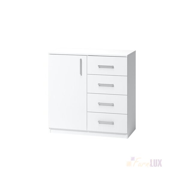 Komoda "Glomo" to mebel charakteryzujący się ciekawym designem. Szafka posiada cztery pojemne zamknięte szuflady oraz jedne drzwi otwierzane. Komoda jest meblem wielofunkcyjnym zarówno do pokoju dla dziecka, garderoby, salonu, przedpokoju lub pokoju młodzieżowego.