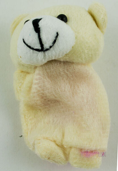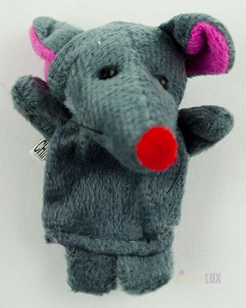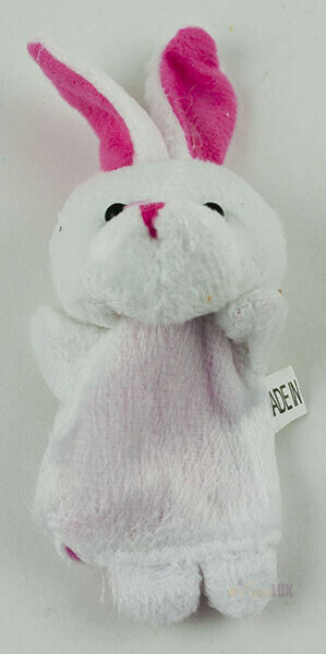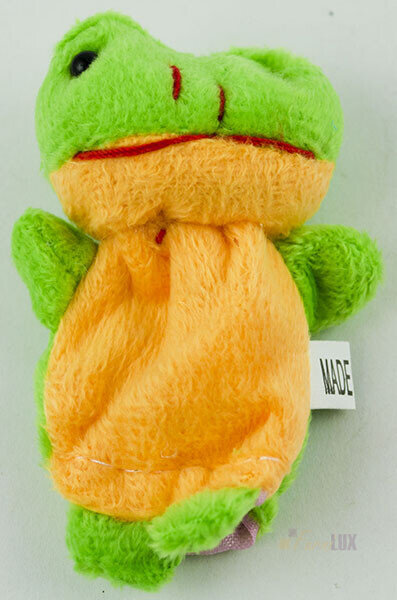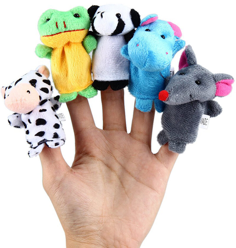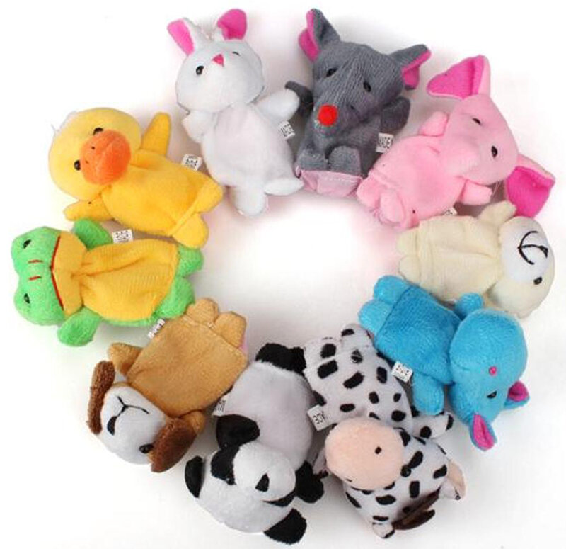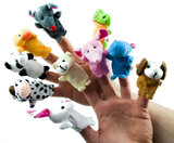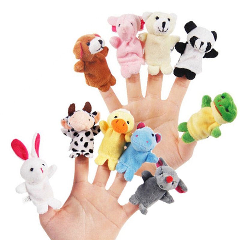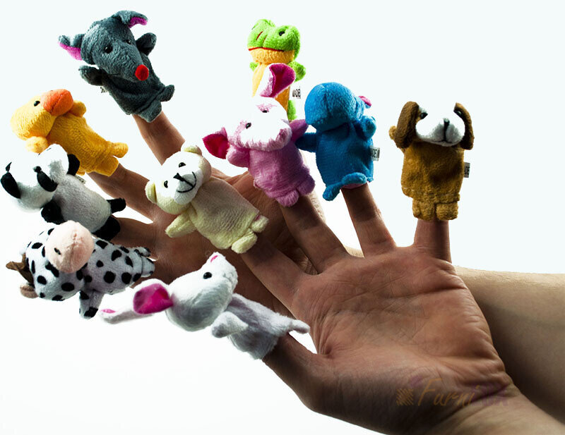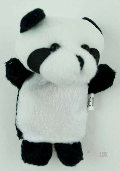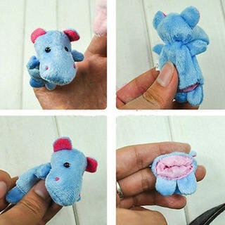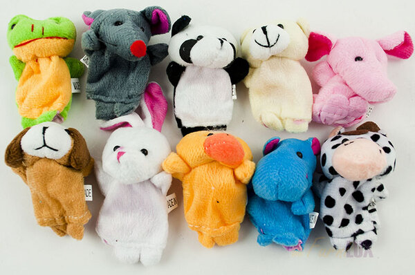Komplet pluszowych, różnokolorowych pacynek na palce w kształcie zwierzątek: hipopotama, słonia, królika, kaczki, krowy, psa, pandy, niedźwiedzia, myszy i żaby. Komplet zawiera 10 pacynek. Wymiary: długość 6,5-7cm, szerokość 5,5-6cm.