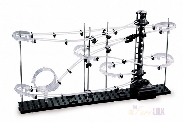 - Połączenie wszystkich elementów finalnie daje wielki tor, po którym wędrują metalowe kulki. Zjeżdżają one przez pętle jedna za drugą aż dotrą do windy, która wiezie je na sam szczyt budowli, gdzie zabawa zaczyna się od nowa.