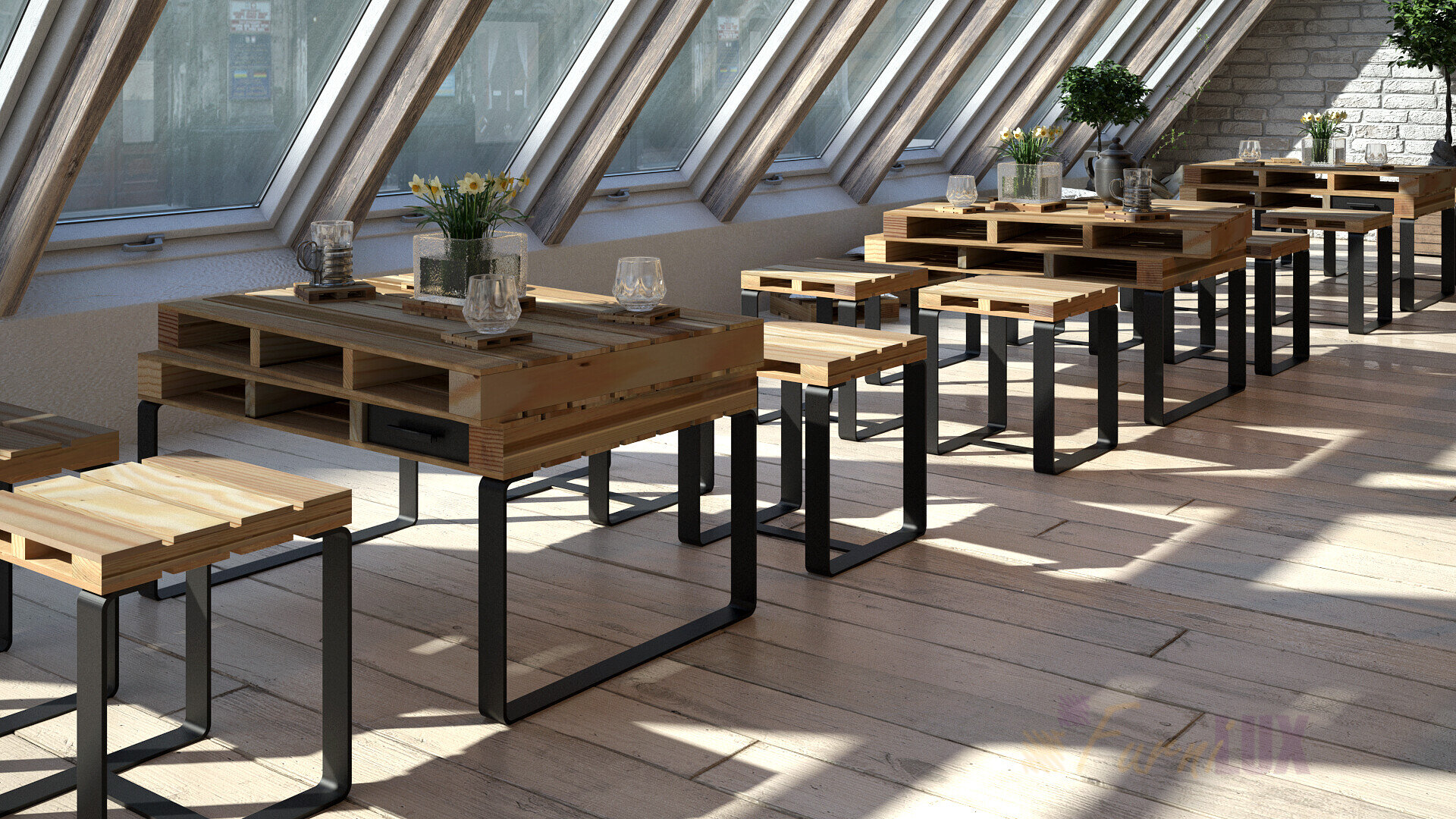 Kolekcja Palet to nowoczesne meble wykonane z drewna sosnowego w połączeniu z czarnymi, metalowymi elementami. Jednym z większych atututów kolekcji jest fakt, że meble sprawdzają się we wnętrzach industrialnych, rustykalnych jak i nowoczesnych. Kolejny plus to to, że meble nadają się również na tarasy zewnętrzne, werandy itd. co wpływa na wyeliminowanie sezonowości. Solidna jakość i wykończenie wpływa na zmniejszenie reklamacji do minimum. Kolekcja będzie się rozrastać o kolejne pozycję, natomiast na tą chwilę dostępne są: taborety, stołki, hokery, stoliki, półki oraz szuflady.