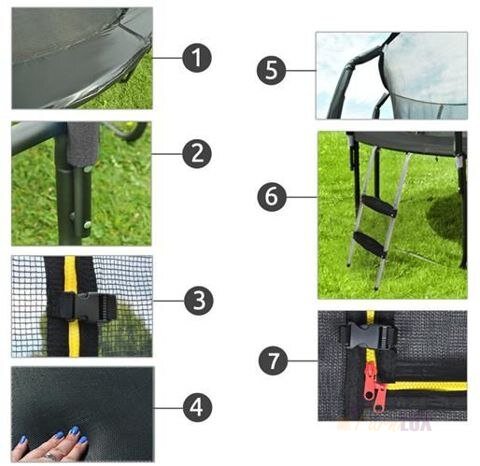 Masywna konstrukcja, grube rurki (duża średnica i grubsza ścianka) oraz wytrzymałe materiały zapewniają stabilność trampoliny. Zarówno piankowe okładziny słupków, jak i mata jest odporna na czynniki atmosferyczne i promieniowanie UV. Mata całkowicie pokrywa sprężyny i ramę dlatego zabawa jest całkowicie bezpieczna.